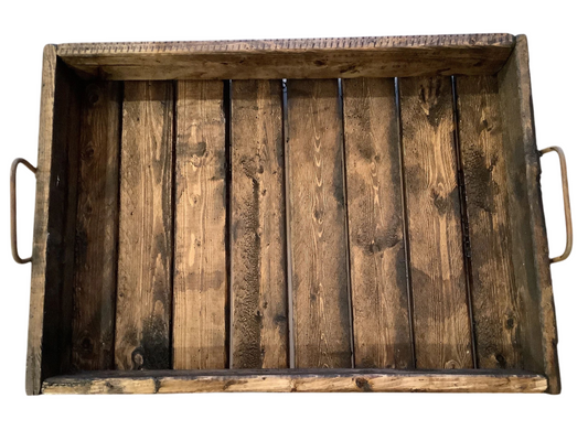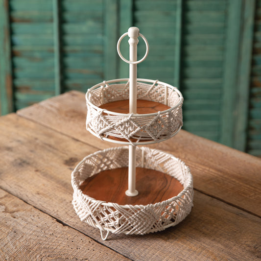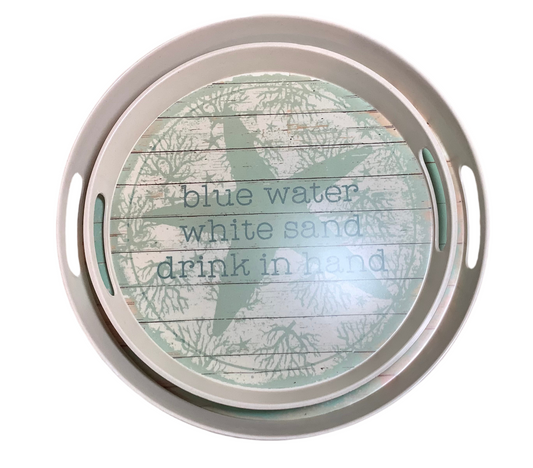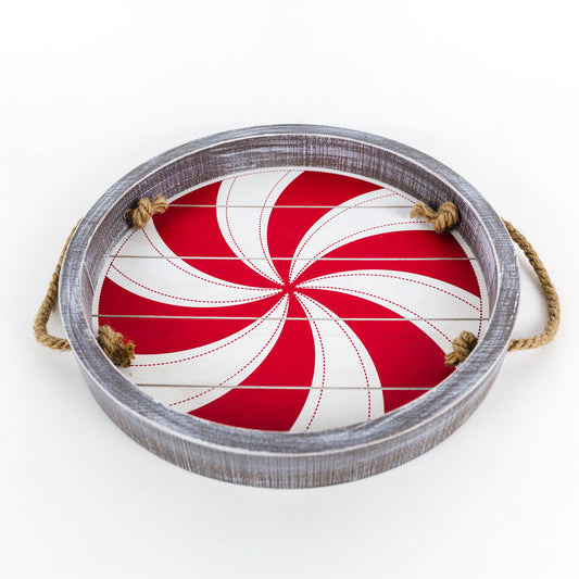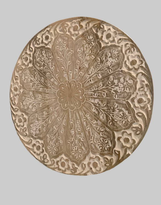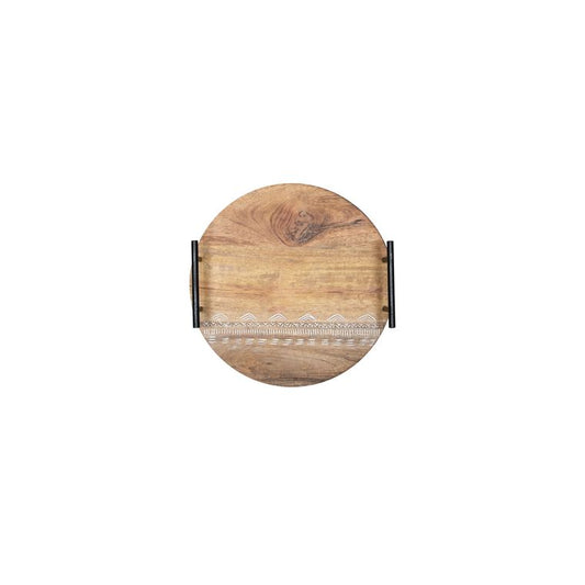 16” ROUND WOOD AND ETCHED BLACK METAL TRAY